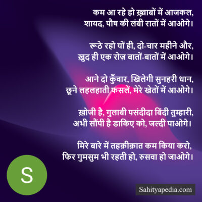 Activity Post Likes Comment Likes Comments Surinder blackpen liked ललकार भारद्वाज's post बांग्लादेश में हिन्दुओ को निशाना बनाकर बलत्कृत, हत्या और चुन 1 year ago Surinder blackpen liked Arghyadeep Chakraborty's post भक्ति गीत 1 year ago Surinder blackpen liked अनिल कुमार गुप्ता 'अंजुम''s post मुक्तक 1 year ago Surinder blackpen liked Ajit Kumar "Karn"'s post बड़े पद का घमंड इतना ना करो, 1 year ago Surinder blackpen liked सुखविंद्र सिंह मनसीरत's post *जो जीता वही सिकंदर है* 1 year ago Surinder blackpen liked Dr.Khedu Bharti's post 4582.*पूर्णिका* 1 year ago Surinder blackpen liked Shreedhar's post फिर तुम्हारी आरिज़ों पे जुल्फ़ याद आई, 1 year ago Surinder blackpen liked their post प्रेम पत्र जब लिखा ,जो मन में था सब लिखा। 1 year ago Surinder blackpen liked Rajiv Verma's post किसी भी वार्तालाप की यह अनिवार्यता है कि प्रयुक्त सभी शब्द स 2 years ago Surinder blackpen liked Shreedhar's book Ek Mutthi Lakeerein 2 years ago Surinder blackpen liked Sahityapedia's post Poetry Writing Challenge-2 2 years ago Surinder blackpen liked their post चांद बहुत रोया 2 years ago Surinder blackpen liked Shreedhar's post कम आ रहे हो ख़़्वाबों में आजकल, 2 years ago Surinder blackpen liked Shreedhar's post अब उनकी आँखों में वो बात कहाँ, 2 years ago Surinder blackpen liked gurudeenverma198's post आँखों से गिराकर नहीं आँसू तुम 2 years ago Surinder blackpen liked Ram Krishan Rastogi's post पति पत्नी पर हास्य व्यंग 2 years ago Surinder blackpen liked Mahender Singh's post सब वर्ताव पर निर्भर है 2 years ago Surinder blackpen liked Pushpraj Anant's post "नींद की तलाश" 2 years ago Surinder blackpen liked Mahender Singh's post हुनरमंद लोग तिरस्कृत क्यों 2 years ago Surinder blackpen liked डॉ. रजनी अग्रवाल 'वाग्देवी रत्ना''s post माँ दुर्गा के दोहे 2 years ago Page 1 Next