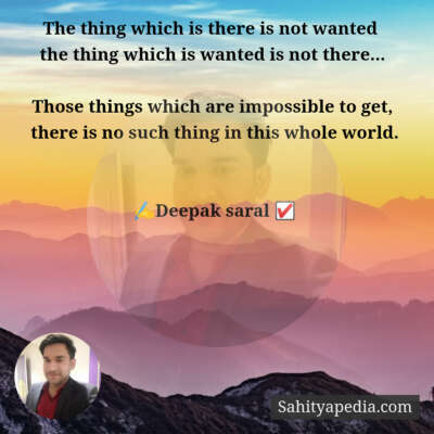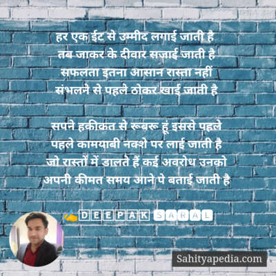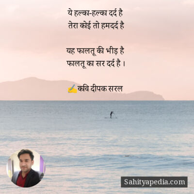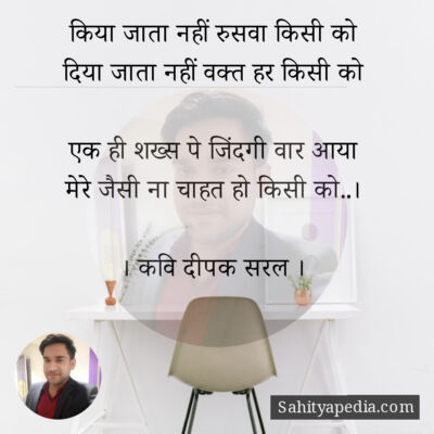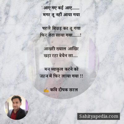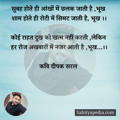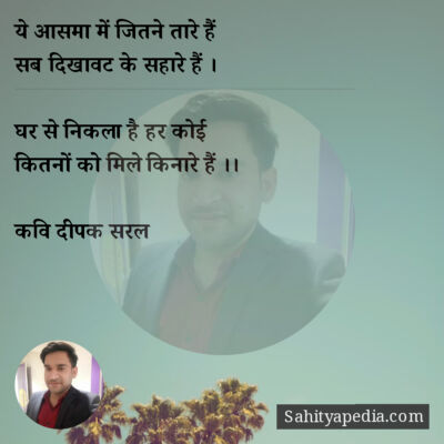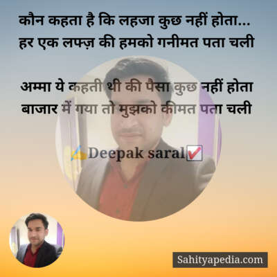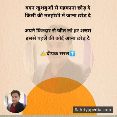 Activity Post Likes Comment Likes Comments दीपक बवेजा सरल liked their post *दर्द के रंग* एक उपन्यास ( कवि दीपक सरल) 2 months ago दीपक बवेजा सरल liked their post सुबह होते ही आंखों में छलक जाती है ,भूख 4 months ago दीपक बवेजा सरल liked their post आंखों के परदे से जानो, दिखता है जो सज ना मानो , 4 months ago दीपक बवेजा सरल liked Astuti Kumari's post वक्त 4 months ago दीपक बवेजा सरल liked Astuti Kumari's post मन को कचोटती विग्रह की पीड़ा, 4 months ago दीपक बवेजा सरल liked their post बस एक बार और……… 1 year ago दीपक बवेजा सरल liked their post रोशन सारा शहर देखा 1 year ago दीपक बवेजा सरल liked their post कुछ तो कर गुजरने का 1 year ago दीपक बवेजा सरल liked their post आए गए कई आए...... 1 year ago दीपक बवेजा सरल liked their post ये हल्का-हल्का दर्द है 1 year ago दीपक बवेजा सरल liked their post ये आसमा में जितने तारे हैं 1 year ago दीपक बवेजा सरल liked their post किया जाता नहीं रुसवा किसी को 1 year ago दीपक बवेजा सरल liked their post दीपक सरल के मुक्तक 1 year ago दीपक बवेजा सरल liked their post नहीं आया था वो रास उसको , 2 years ago दीपक बवेजा सरल liked their post बदन खुशबुओं से महकाना छोड़ दे 2 years ago दीपक बवेजा सरल liked their post कौन कहता है कि लहजा कुछ नहीं होता... 2 years ago दीपक बवेजा सरल liked their post The thing which is there is not wanted 2 years ago दीपक बवेजा सरल liked their post हर एक ईट से उम्मीद लगाई जाती है 2 years ago दीपक बवेजा सरल liked their post आखिर कुछ तो सबूत दो क्यों तुम जिंदा हो 2 years ago दीपक बवेजा सरल liked their post एक पौधा तो अपना भी उगाना चाहिए 2 years ago Page 1 Next