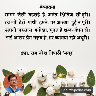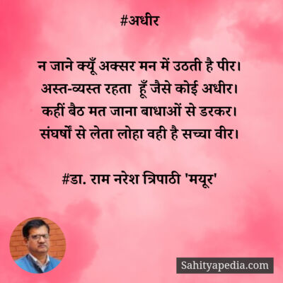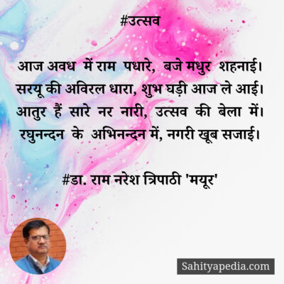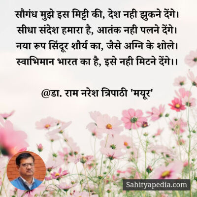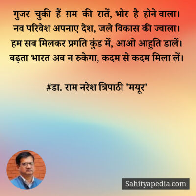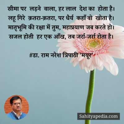 Activity Post Likes Comment Likes Comments Pinki liked डा. राम नरेश त्रिपाठी 'मयूर''s post फ़ुर्सत के पल निकालकर कभी ख़ुद से भी मिलो 1 month ago Pinki liked डा. राम नरेश त्रिपाठी 'मयूर''s post वीर सपूत 2 months ago Pinki liked डा. राम नरेश त्रिपाठी 'मयूर''s post #अधीर 2 months ago Pinki liked डा. राम नरेश त्रिपाठी 'मयूर''s post सौगंध मुझे इस मिट्टी की, देश नही झुकने देंगे। 2 months ago Pinki liked डा. राम नरेश त्रिपाठी 'मयूर''s post हम हैं राही शांत डगर के, अब बाजों ने ठाना है। 2 months ago Pinki liked डा. राम नरेश त्रिपाठी 'मयूर''s post जल संरक्षण-बाल गीत 2 months ago Pinki liked डा. राम नरेश त्रिपाठी 'मयूर''s post #कुमुद 2 months ago Pinki liked डा. राम नरेश त्रिपाठी 'मयूर''s post #विरह 2 months ago Pinki liked डा. राम नरेश त्रिपाठी 'मयूर''s post गुजर चुकी हैं ग़म की रातें, भोर है होने वाला। 2 months ago Pinki liked डा. राम नरेश त्रिपाठी 'मयूर''s post #अस्मत 2 months ago Pinki liked डा. राम नरेश त्रिपाठी 'मयूर''s post सोचा था पढ़ूँगा ख़ुद को कभी फ़ुर्सत से 2 months ago Pinki liked डा. राम नरेश त्रिपाठी 'मयूर''s post कौन है अपना कौन पराया मुश्किल है पहचान। 2 months ago Pinki liked डा. राम नरेश त्रिपाठी 'मयूर''s post रक्षाबंधन-वर्ण पिरामिड 2 months ago Pinki liked डा. राम नरेश त्रिपाठी 'मयूर''s post #व्याख्या 4 months ago Pinki liked डा. राम नरेश त्रिपाठी 'मयूर''s post ना तुमसे कोई गिला 4 months ago Pinki liked डा. राम नरेश त्रिपाठी 'मयूर''s post नक़ाब ओढ़ शराफ़त का, अपने ही तो ठगते हैं। 4 months ago Pinki liked डा. राम नरेश त्रिपाठी 'मयूर''s post #उत्सव 4 months ago Pinki liked डा. राम नरेश त्रिपाठी 'मयूर''s post #कश्ती 4 months ago Pinki liked डा. राम नरेश त्रिपाठी 'मयूर''s post सीमा पर लड़ने वाला, हर लाल देश का होता है। 4 months ago Pinki liked डा. राम नरेश त्रिपाठी 'मयूर''s post चिर यौवन 4 months ago Page 1 Next