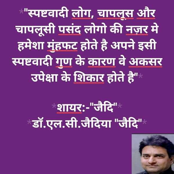 “स्पष्टवादी लोग, चापलूस और चापलूसी पसंद लोगो की नज़र मे हमेशा मुंहफट होते है अपने इसी स्पष्टवादी गुण के कारण वे उपेक्षा के शिकार होते है”