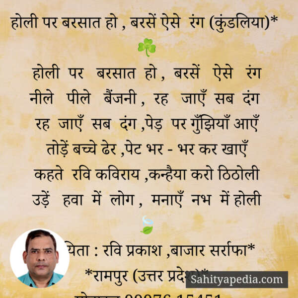 होली पर बरसात हो , बरसें ऐसे रंग (कुंडलिया)*