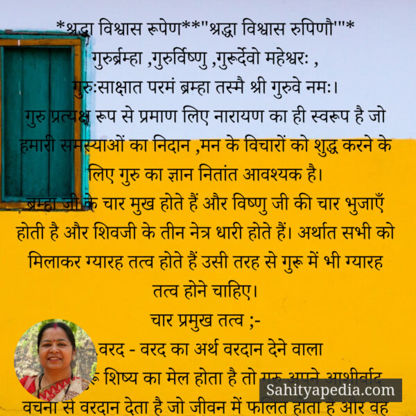गुरु प्रत्यक्ष रूप से प्रमाण लिए नारायण का ही स्वरूप है जो हमारी समस्याओं का निदान ,मन के विचारों को शुद्ध करने के लिए गुरु का ज्ञान नितांत आवश्यक है।