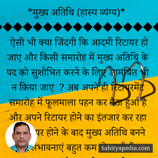 ऐसी भी क्या जिंदगी कि आदमी रिटायर हो जाए और किसी समारोह में मुख्य अतिथि के पद को सुशोभित करने के लिए आमंत्रित भी न किया जाए ? अब अपने ही रिटायरमेंट समारोह में फूलमाला पहन कर बैठा हुआ है और अपने रिटायर होने का इंतजार कर रहा है। रिटायर होने के बाद मुख्य अतिथि बनने की संभावनाएं बहुत कम हो जाती हैं।