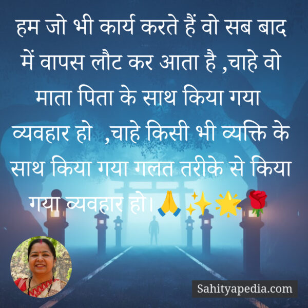 हम जो भी कार्य करते हैं वो सब बाद में वापस लौट कर आता है ,चाहे वो माता पिता के साथ किया गया व्यवहार हो ,चाहे किसी भी व्यक्ति के साथ किया गया गलत तरीके से किया गया व्यवहार हो।🙏✨🌟🌹