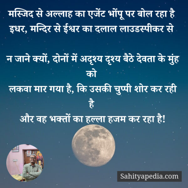 इधर, मन्दिर से ईश्वर का दलाल लाउडस्पीकर से