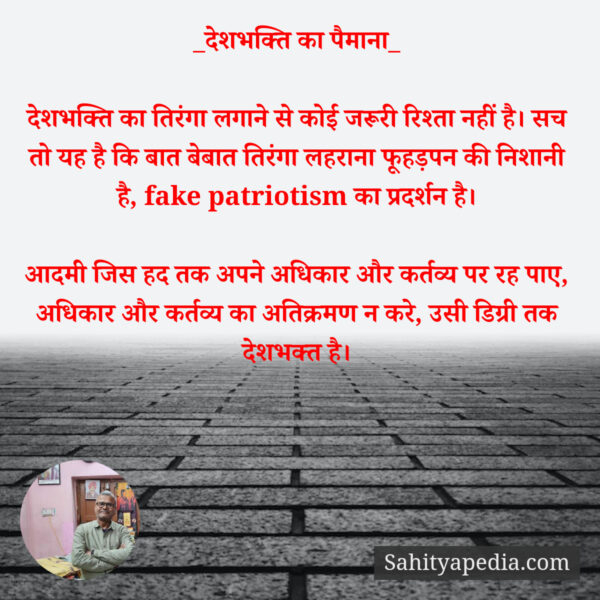 देशभक्ति का तिरंगा लगाने से कोई जरूरी रिश्ता नहीं है। सच तो यह है कि बात बेबात तिरंगा लहराना फूहड़पन की निशानी है, fake patriotism का प्रदर्शन है।