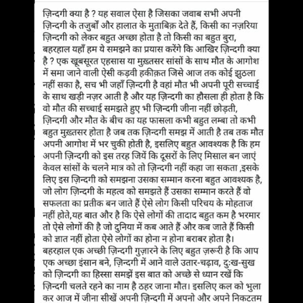 ज़िन्दगी क्या है ? यह सवाल ऐसा है जिसका जवाब सभी अपनी ज़िन्दगी के तजुबों और हालात के मुताबिक़ देते हैं, किसी का नज़रिया ज़िन्दगी को लेकर बहुत अच्छा होता है तो किसी का बहुत बुरा, बहरहाल यहाँ हम ये समझने का प्रयास करेंगे कि आखिर ज़िन्दगी क्या है? एक खूबसूरत एहसास या मुख्तसर सांसों के साथ मौत के आगोश में समा जाने वाली ऐसी कड़वी हकीक़त जिसे आज तक कोई झुठला नहीं सका है, सच भी जहाँ ज़िन्दगी है वहां मौत भी अपनी पूरी सच्चाई के साथ खड़ी नज़र आती है और यह ज़िन्दगी का हौसला ही होता है कि वो मौत की सच्चाई समझते हुए भी ज़िन्दगी जीना नहीं छोड़ती, ज़िन्दगी और मौत के बीच का यह फासला कभी बहुत लम्बा तो कभी बहुत मुख्तसर होता है जब तक ज़िन्दगी समझ में आती है तब तक मौत अपनी आगोश में भर चुकी होती है, इसलिए बहुत आवश्यक है कि हम अपनी ज़िन्दगी को इस तरह जियें कि दूसरों के लिए मिसाल बन जाएं केवल सांसों के चलने मात्र को तो ज़िन्दगी नहीं कहा जा सकता, इसके लिए इस ज़िन्दगी को समझना उसका सम्मान करना बहुत आवश्यक है, जो लोग ज़िन्दगी के महत्व को समझते हैं उसका सम्मान करते हैं वो सफलता का प्रतीक बन जाते हैं ऐसे लोग किसी परिचय के मोहताज नहीं होते, यह बात और है कि ऐसे लोगों की तादाद बहुत कम है भरमार तो ऐसे लोगों की है जो दुनिया में कब आते हैं और कब जाते हैं किसी को ज्ञात नहीं होता ऐसे लोगों का होना न होना बराबर होता है। बहरहाल एक अच्छी ज़िन्दगी गुज़ारने के लिए बहुत ज़रूरी है कि आप एक अच्छा इंसान बने, ज़िन्दगी में आने वाले उतार-चढ़ाव, दुःख-सुख को ज़िन्दगी का हिस्सा समझें इस बात को अच्छे से ध्यान रखें कि ज़िन्दगी चलते रहने का नाम है ठहर जाना मौत इसलिए कल को भुला कर आज में जीना सीखें अपनी जिन्दगी में अपनो और अपने निकटतम सगे-संबंधियों को प्रेम और सम्मान देने के साथ-साथ ज़रूरत पड़ने पर उनकी यथा सम्भव सहायता करने के लिए तत्पर रहें, ध्यान रहे ये रिश्ते ही होते हैं जो हमारीज़िन्दगी को भावनात्मक खुशियों से भरते ही नहीं बल्कि हमारी ज़िन्दगी को स्थिर रखने में भी महत्वपूर्ण भूमिका निभाते हैं इसके साथ ही हर विपरीत परिस्थितियों में अपनी सोच को सकारात्मक रखें क्योंकि 90% हमारी ज़िन्दगी में दुखों का कारण हमारी नकारात्मक सोच होती है, ज़िन्दगी से लेना नहीं ज़िन्दगी को देना सीखें, दूसरों से नहीं खुद से उम्मीदें रखिए वहीं दूसरो की उम्मीदों पर खरा उतरने का प्रयास भी कीजिए आप का इन बातों का ध्यान रखना आपकी ज़िन्दगी से आपकी शिकायतों को कम ही नहीं करेगा बल्कि आपकी ज़िन्दगी को ज़िन्दगी भी बनाता है बस प्रयास आपको करना है। कि आप ज़िन्दगी के आईने में स्वयं को कैसा देखना पसंद करते हैं।