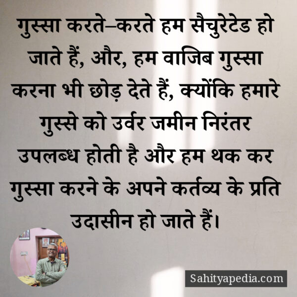 गुस्सा करते–करते हम सैचुरेटेड हो जाते हैं, और, हम वाजिब गुस्सा करना भी छोड़ देते हैं, क्योंकि हमारे गुस्से को उर्वर जमीन निरंतर उपलब्ध होती है और हम थक कर गुस्सा करने के अपने कर्तव्य के प्रति उदासीन हो जाते हैं।