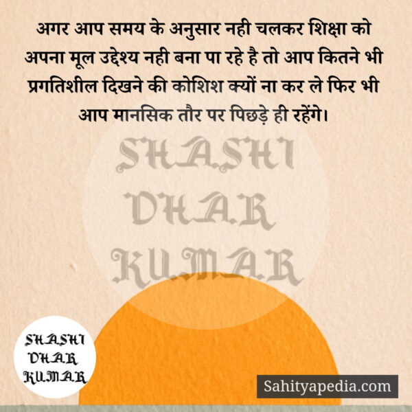 अगर आप समय के अनुसार नही चलकर शिक्षा को अपना मूल उद्देश्य नही बना पा रहे है तो आप कितने भी प्रगतिशील दिखने की कोशिश क्यों ना कर ले फिर भी आप मानसिक तौर पर पिछड़े ही रहेंगे।