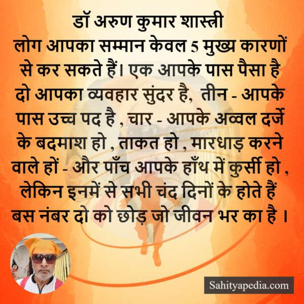 लोग आपका सम्मान केवल 5 मुख्य कारणों से कर सकते हैं। एक आपके पास पैसा है दो आपका व्यवहार सुंदर है, तीन – आपके पास उच्च पद है , चार – आपके अव्वल दर्जे के बदमाश हो , ताकत हो , मारधाड़ करने वाले हों – और पाँच आपके हाँथ में कुर्सी हो , लेकिन इनमें से सभी चंद दिनों के होते हैं बस नंबर दो को छोड़ जो जीवन भर का है ।
