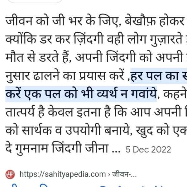जीवन को जी भर के जिए, बेखौफ़ होकर जिए क्योंकि डर कर ज़िंदगी वही लोग गुज़ारते हैं जो मौत से डरते हैं, अपनी जिंदगी को अपनी इच्छा नुसार ढालने का प्रयास करें,हर पल का सदुपयोग करें एक पल को भी व्यर्थ न गवांये, कहने का तात्पर्य है केवल इतना है कि आप अपनी जिंदगी को सार्थक व उपयोगी बनाये, खुद को एक पहचान दे गुमनाम जिंदगी जीना किसी भी दृष्टि से उचित नहीं ।