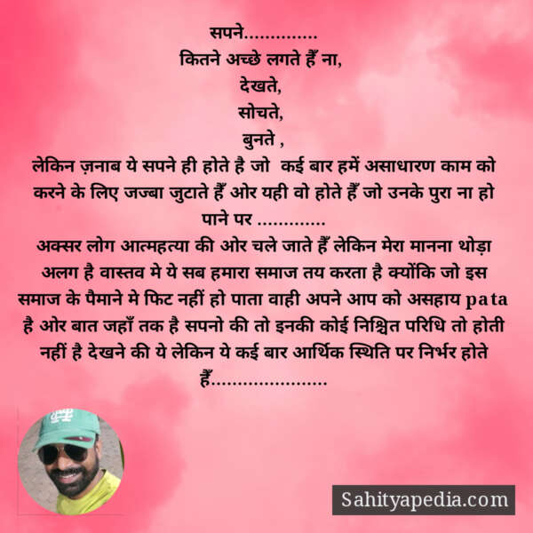 अक्सर लोग आत्महत्या की ओर चले जाते हैँ लेकिन मेरा मानना थोड़ा अलग है वास्तव मे ये सब हमारा समाज तय करता है क्योंकि जो इस समाज के पैमाने मे फिट नहीं हो पाता वाही अपने आप को असहाय pata है ओर बात जहाँ तक है सपनो की तो इनकी कोई निश्चित परिधि तो होती नहीं है देखने की ये लेकिन ये कई बार आर्थिक स्थिति पर निर्भर होते हैँ………………….