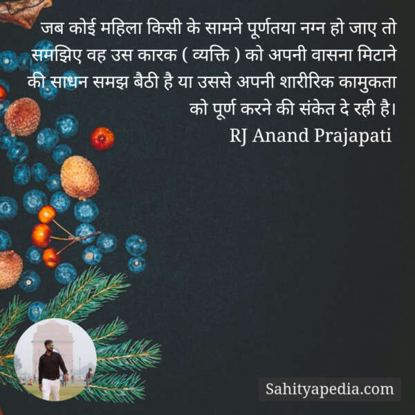 जब कोई महिला किसी के सामने पूर्णतया नग्न हो जाए तो समझिए वह उस कारक ( व्यक्ति ) को अपनी वासना मिटाने की साधन समझ बैठी है या उससे अपनी शारीरिक कामुकता को पूर्ण करने की संकेत दे रही है।