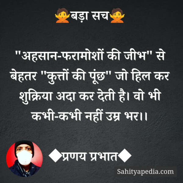 “рдЕрд╣рд╕рд╛рди-рдлрд░рд╛рдореЛрд╢реЛрдВ рдХреА рдЬреАрдн” рд╕реЗ рдмреЗрд╣рддрд░ “рдХреБрддреНрддреЛрдВ рдХреА рдкреВрдВрдЫ” рдЬреЛ рд╣рд┐рд▓ рдХрд░ рд╢реБрдХреНрд░рд┐рдпрд╛ рдЕрджрд╛ рдХрд░ рджреЗрддреА рд╣реИред рд╡реЛ рднреА рдХрднреА-рдХрднреА рдирд╣реАрдВ рдЙрдореНрд░ рднрд░редред