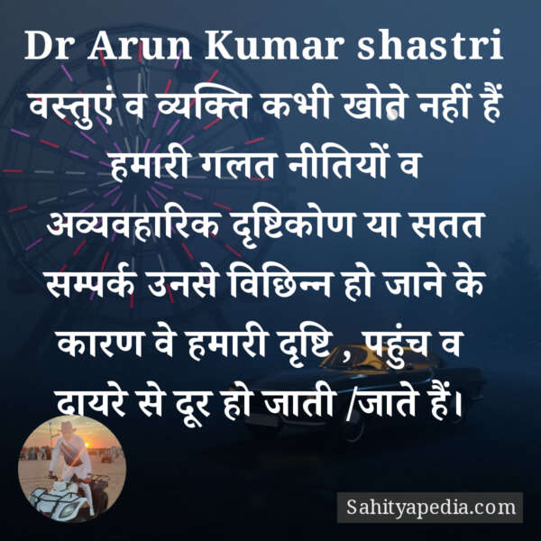 वस्तुएं व व्यक्ति कभी खोते नहीं हैं हमारी गलत नीतियों व अव्यवहारिक दृष्टिकोण या सतत सम्पर्क उनसे विछिन्न हो जाने के कारण वे हमारी दृष्टि , पहुंच व दायरे से दूर हो जाती /जाते हैं।