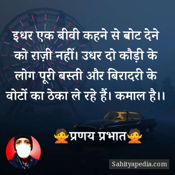 इधर एक बीवी कहने से वोट देने को राज़ी नहीं। उधर दो कौड़ी के लोग पूरी बस्ती और बिरादरी के वोटों का ठेका ले रहे हैं। कमाल है।।