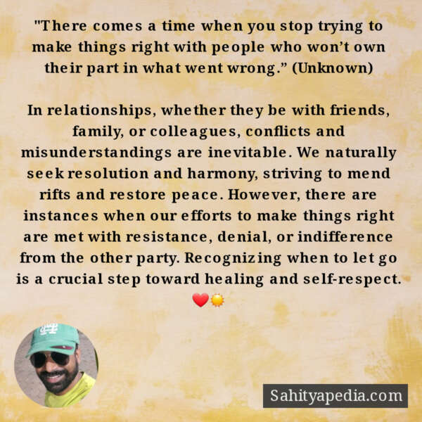 In relationships, whether they be with friends, family, or colleagues, conflicts and misunderstandings are inevitable. We naturally seek resolution and harmony, striving to mend rifts and restore peace. However, there are instances when our efforts to make things right are met with resistance, denial, or indifference from the other party. Recognizing when to let go is a crucial step toward healing and self-respect. ❤☀