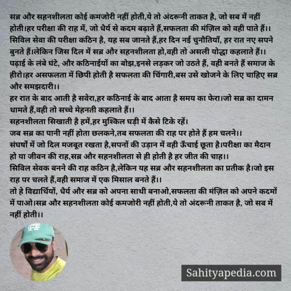सिविल सेवा की परीक्षा कठिन है, यह सब जानते हैं,हर दिन नई चुनौतियाँ, हर रात नए सपने बुनते हैं।लेकिन जिस दिल में सब्र और सहनशीलता हो,वही तो असली योद्धा कहलाते हैं।।