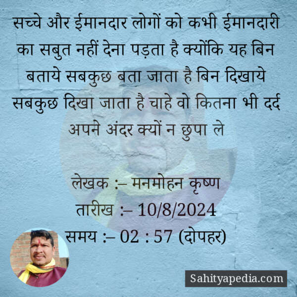 सच्चे और ईमानदार लोगों को कभी ईमानदारी का सबुत नहीं देना पड़ता है क्योंकि यह बिन बताये सबकुछ बता जाता है बिन दिखाये सबकुछ दिखा जाता है चाहे वो कितना भी दर्द अपने अंदर क्यों न छुपा ले