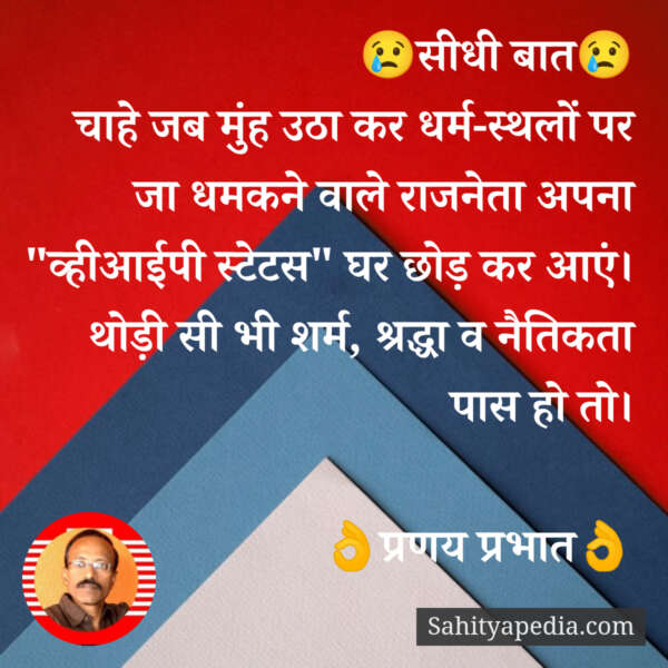 рдЪрд╛рд╣реЗ рдЬрдм рдореБрдВрд╣ рдЙрдард╛ рдХрд░ рдзрд░реНрдо-рд╕реНрдерд▓реЛрдВ рдкрд░ рдЬрд╛ рдзрдордХрдиреЗ рд╡рд╛рд▓реЗ рд░рд╛рдЬрдиреЗрддрд╛ рдЕрдкрдирд╛ “рд╡реНрд╣реАрдЖрдИрдкреА рд╕реНрдЯреЗрдЯрд╕” рдШрд░ рдЫреЛреЬ рдХрд░ рдЖрдПрдВред рдереЛреЬреА рд╕реА рднреА рд╢рд░реНрдо, рд╢реНрд░рджреНрдзрд╛ рд╡ рдиреИрддрд┐рдХрддрд╛ рдкрд╛рд╕ рд╣реЛ рддреЛред