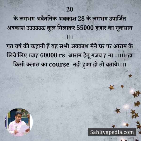 गत वर्ष की कहानी हैं यह सभी अवकाश मैने घर पर आराम के लिये लिए ।वाह 60000 rs आराम हेतू गजब ह ना ।।।।।।हा किसी क्लास का course नही हुआ हो तो बताये।।।।