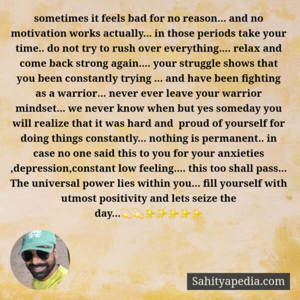 sometimes it feels bad for no reason… and no motivation works actually… in those periods take your time.. do not try to rush over everything…. relax and come back strong again…. your struggle shows that you been constantly trying … and have been fighting as a warrior… never ever leave your warrior mindset… we never know when but yes someday you will realize that it was hard and proud of yourself for doing things constantly… nothing is permanent.. in case no one said this to you for your anxieties ,depression,constant low feeling…. this too shall pass… The universal power lies within you… fill yourself with utmost positivity and lets seize the day…💫💫✨✨✨✨✨