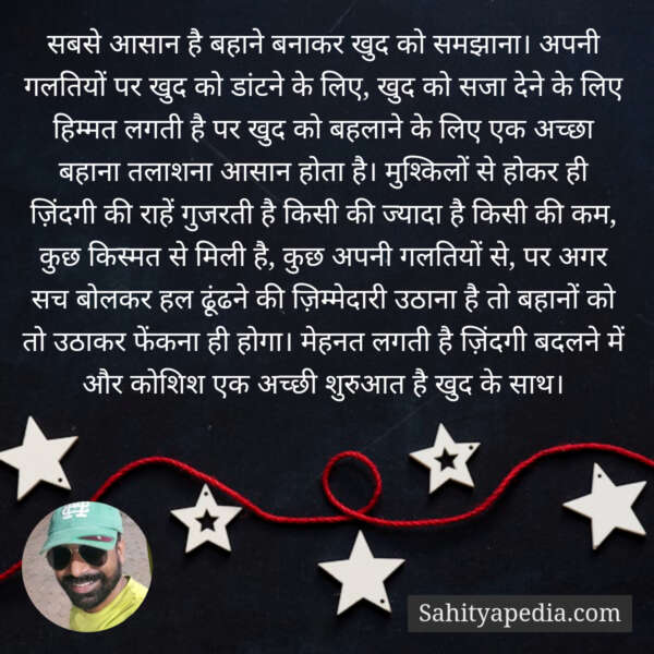 सबसे आसान है बहाने बनाकर खुद को समझाना। अपनी गलतियों पर खुद को डांटने के लिए, खुद को सजा देने के लिए हिम्मत लगती है पर खुद को बहलाने के लिए एक अच्छा बहाना तलाशना आसान होता है। मुश्किलों से होकर ही ज़िंदगी की राहें गुजरती है किसी की ज्यादा है किसी की कम, कुछ किस्मत से मिली है, कुछ अपनी गलतियों से, पर अगर सच बोलकर हल ढूंढने की ज़िम्मेदारी उठाना है तो बहानों को तो उठाकर फेंकना ही होगा। मेहनत लगती है ज़िंदगी बदलने में और कोशिश एक अच्छी शुरुआत है खुद के साथ।
