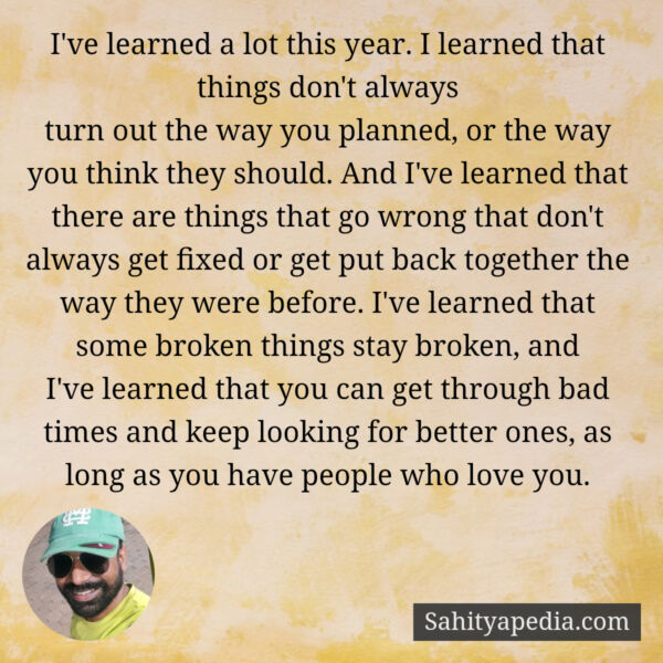 turn out the way you planned, or the way you think they should. And I’ve learned that there are things that go wrong that don’t always get fixed or get put back together the way they were before. I’ve learned that some broken things stay broken, and
