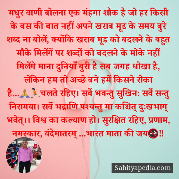 मधुर वाणी बोलना एक मंहगा शौक है जो हर किसी के बस की बात नहीं अपने खराब मूड के समय बुरे शब्द ना बोलें, क्योंकि खराब मूड को बदलने के बहुत मौके मिलेंगें पर शब्दों को बदलने के मोके नहीं मिलेंगे माना दुनियाँ बुरी है सब जगह धोखा है, लेकिन हम तो अच्छे बने हमें किसने रोका है…🙏🏃🏻चलते रहिए। सर्वे भवन्तु सुखिनः सर्वे सन्तु निरामया। सर्वे भद्राणि पश्यन्तु मा कश्चित् दुःखभाग् भवेत्।। विश्व का कल्याण हो। सुरक्षित रहिए, प्रणाम, नमस्कार, वंदेमातरम् …भारत माता की जय🚭‼️