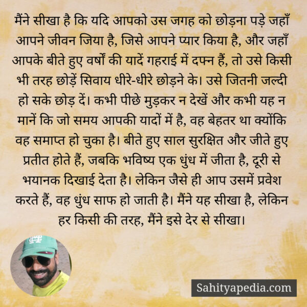 मैंने सीखा है कि यदि आपको उस जगह को छोड़ना पड़े जहाँ आपने जीवन जिया है, जिसे आपने प्यार किया है, और जहाँ आपके बीते हुए वर्षों की यादें गहराई में दफ्न हैं, तो उसे किसी भी तरह छोड़ें सिवाय धीरे-धीरे छोड़ने के। उसे जितनी जल्दी हो सके छोड़ दें। कभी पीछे मुड़कर न देखें और कभी यह न मानें कि जो समय आपकी यादों में है, वह बेहतर था क्योंकि वह समाप्त हो चुका है। बीते हुए साल सुरक्षित और जीते हुए प्रतीत होते हैं, जबकि भविष्य एक धुंध में जीता है, दूरी से भयानक दिखाई देता है। लेकिन जैसे ही आप उसमें प्रवेश करते हैं, वह धुंध साफ हो जाती है। मैंने यह सीखा है, लेकिन हर किसी की तरह, मैंने इसे देर से सीखा।