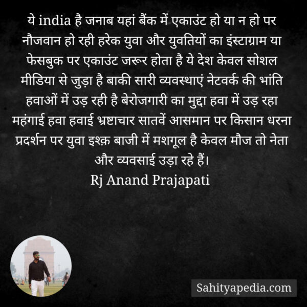 ये india है जनाब यहां बैंक में एकाउंट हो या न हो पर नौजवान हो रही हरेक युवा और युवतियों का इंस्टाग्राम या फेसबुक पर एकाउंट जरूर होता है ये देश केवल सोशल मीडिया से जुड़ा है बाकी सारी व्यवस्थाएं नेटवर्क की भांति हवाओं में उड़ रही है बेरोजगारी का मुद्दा हवा में उड़ रहा महंगाई हवा हवाई भ्रष्टाचार सातवें आसमान पर किसान धरना प्रदर्शन पर युवा इश्क़ बाजी में मशगूल है केवल मौज तो नेता और व्यवसाई उड़ा रहे हैं।