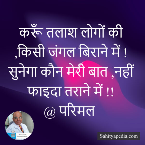 करूँ तलाश लोगों की ,किसी जंगल बिराने में !