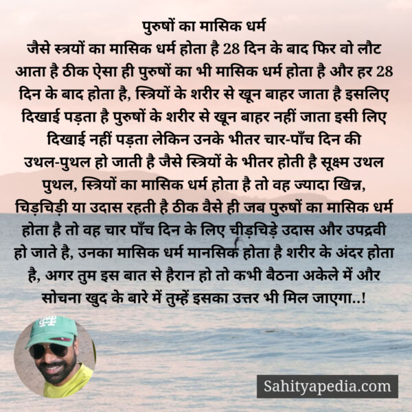 जैसे स्त्रयों का मासिक धर्म होता है 28 दिन के बाद फिर वो लौट आता है ठीक ऐसा ही पुरुषों का भी मासिक धर्म होता है और हर 28 दिन के बाद होता है, स्त्रियों के शरीर से खून बाहर जाता है इसलिए दिखाई पड़ता है पुरुषों के शरीर से खून बाहर नहीं जाता इसी लिए दिखाई नहीं पड़ता लेकिन उनके भीतर चार-पाँच दिन की उथल-पुथल हो जाती है जैसे स्त्रियों के भीतर होती है सूक्ष्म उथल पुथल, स्त्रियों का मासिक धर्म होता है तो वह ज्यादा खिन्न, चिड़चिड़ी या उदास रहती है ठीक वैसे ही जब पुरुषों का मासिक धर्म होता है तो वह चार पाँच दिन के लिए चीड़चिड़े उदास और उपद्रवी हो जाते है, उनका मासिक धर्म मानसिक होता है शरीर के अंदर होता है, अगर तुम इस बात से हैरान हो तो कभी बैठना अकेले में और सोचना खुद के बारे में तुम्हें इसका उत्तर भी मिल जाएगा..!