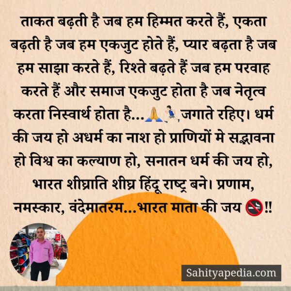 ताकत बढ़ती है जब हम हिम्मत करते हैं, एकता बढ़ती है जब हम एकजुट होते हैं, प्यार बढ़ता है जब हम साझा करते हैं, रिश्ते बढ़ते हैं जब हम परवाह करते हैं और समाज एकजुट होता है जब नेतृत्व करता निस्वार्थ होता है…🙏🏃🏻♂️जगाते रहिए। धर्म की जय हो अधर्म का नाश हो प्राणियों मे सद्भावना हो विश्व का कल्याण हो, सनातन धर्म की जय हो, भारत शीघ्राति शीघ्र हिंदू राष्ट्र बने। प्रणाम, नमस्कार, वंदेमातरम…भारत माता की जय 🚭‼️