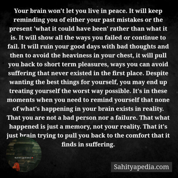 Your brain won’t let you live in peace. It will keep reminding you of either your past mistakes or the present ‘what it could have been’ rather than what it is. It will show all the ways you failed or continue to fail. It will ruin your good days with bad thoughts and then to avoid the heaviness in your chest, it will pull you back to short term pleasures, ways you can avoid suffering that never existed in the first place. Despite wanting the best things for yourself, you may end up treating yourself the worst way possible. It’s in these moments when you need to remind yourself that none of what’s happening in your brain exists in reality. That you are not a bad person nor a failure. That what happened is just a memory, not your reality. That it’s just brain trying to pull you back to the comfort that it finds in suffering.