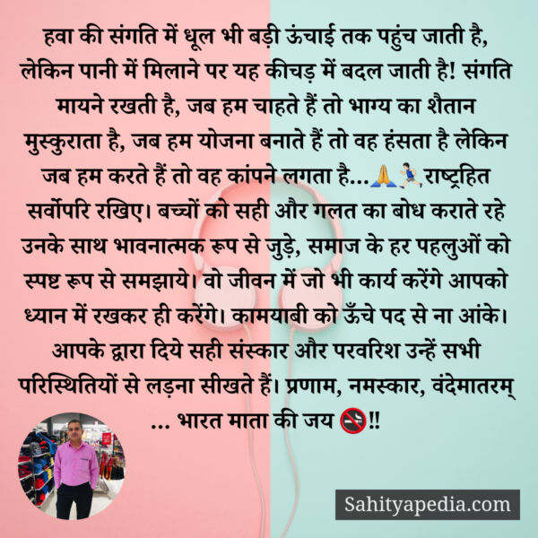 हवा की संगति में धूल भी बड़ी ऊंचाई तक पहुंच जाती है, लेकिन पानी में मिलाने पर यह कीचड़ में बदल जाती है! संगति मायने रखती है, जब हम चाहते हैं तो भाग्य का शैतान मुस्कुराता है, जब हम योजना बनाते हैं तो वह हंसता है लेकिन जब हम करते हैं तो वह कांपने लगता है…🙏🏃🏻♂️राष्ट्रहित सर्वोपरि रखिए। बच्चों को सही और गलत का बोध कराते रहे उनके साथ भावनात्मक रूप से जुड़े, समाज के हर पहलुओं को स्पष्ट रूप से समझाये। वो जीवन में जो भी कार्य करेंगे आपको ध्यान में रखकर ही करेंगे। कामयाबी को ऊँचे पद से ना आंके। आपके द्वारा दिये सही संस्कार और परवरिश उन्हें सभी परिस्थितियों से लड़ना सीखते हैं। प्रणाम, नमस्कार, वंदेमातरम् … भारत माता की जय 🚭‼️