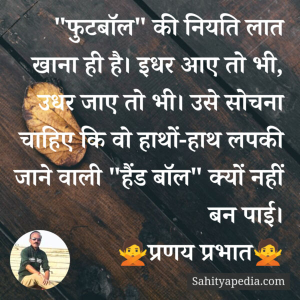 “फुटबॉल” की नियति लात खाना ही है। इधर आए तो भी, उधर जाए तो भी। उसे सोचना चाहिए कि वो हाथों-हाथ लपकी जाने वाली “हैंड बॉल” क्यों नहीं बन पाई।