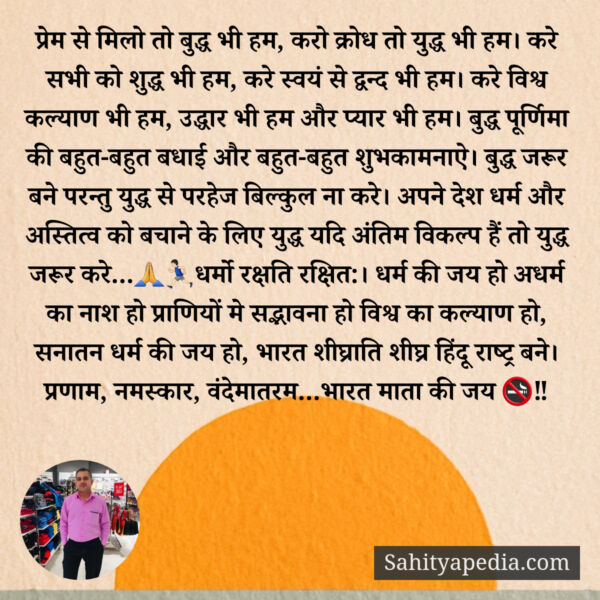 प्रेम से मिलो तो बुद्ध भी हम, करो क्रोध तो युद्ध भी हम। करे सभी को शुद्ध भी हम, करे स्वयं से द्वन्द भी हम। करे विश्व कल्याण भी हम, उद्धार भी हम और प्यार भी हम। बुद्ध पूर्णिमा की बहुत-बहुत बधाई और बहुत-बहुत शुभकामनाऐ। बुद्ध जरूर बने परन्तु युद्ध से परहेज बिल्कुल ना करे। अपने देश धर्म और अस्तित्व को बचाने के लिए युद्ध यदि अंतिम विकल्प हैं तो युद्ध जरूर करे…🙏🏃🏻♂️धर्मो रक्षति रक्षित:। धर्म की जय हो अधर्म का नाश हो प्राणियों मे सद्भावना हो विश्व का कल्याण हो, सनातन धर्म की जय हो, भारत शीघ्राति शीघ्र हिंदू राष्ट्र बने। प्रणाम, नमस्कार, वंदेमातरम…भारत माता की जय 🚭‼️