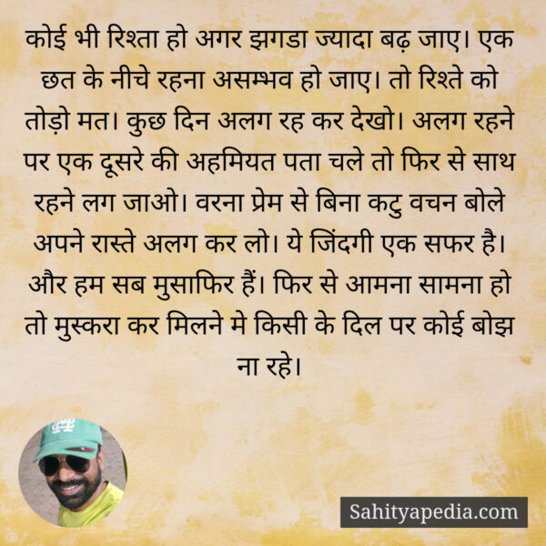 कोई भी रिश्ता हो अगर झगडा ज्यादा बढ़ जाए। एक छत के नीचे रहना असम्भव हो जाए। तो रिश्ते को तोड़ो मत। कुछ दिन अलग रह कर देखो। अलग रहने पर एक दूसरे की अहमियत पता चले तो फिर से साथ रहने लग जाओ। वरना प्रेम से बिना कटु वचन बोले अपने रास्ते अलग कर लो। ये जिंदगी एक सफर है। और हम सब मुसाफिर हैं। फिर से आमना सामना हो तो मुस्करा कर मिलने मे किसी के दिल पर कोई बोझ ना रहे।