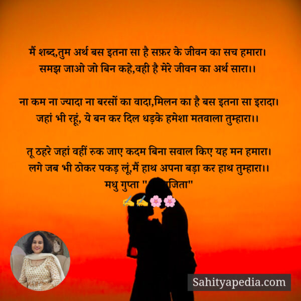 मैं शब्द,तुम अर्थ बस इतना सा है जीवन के सफ़र का सच हमारा।