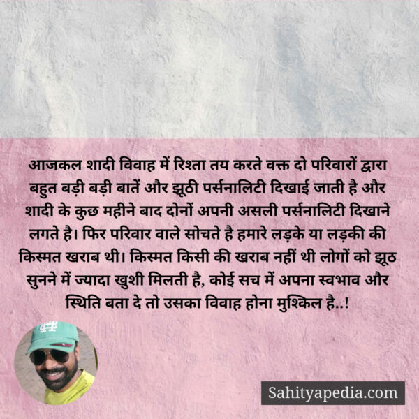 आजकल शादी विवाह में रिश्ता तय करते वक्त दो परिवारों द्वारा बहुत बड़ी बड़ी बातें और झूठी पर्सनालिटी दिखाई जाती है और शादी के कुछ महीने बाद दोनों अपनी असली पर्सनालिटी दिखाने लगते है। फिर परिवार वाले सोचते है हमारे लड़के या लड़की की किस्मत खराब थी। किस्मत किसी की खराब नहीं थी लोगों को झूठ सुनने में ज्यादा खुशी मिलती है, कोई सच में अपना स्वभाव और स्थिति बता दे तो उसका विवाह होना मुश्किल है..!