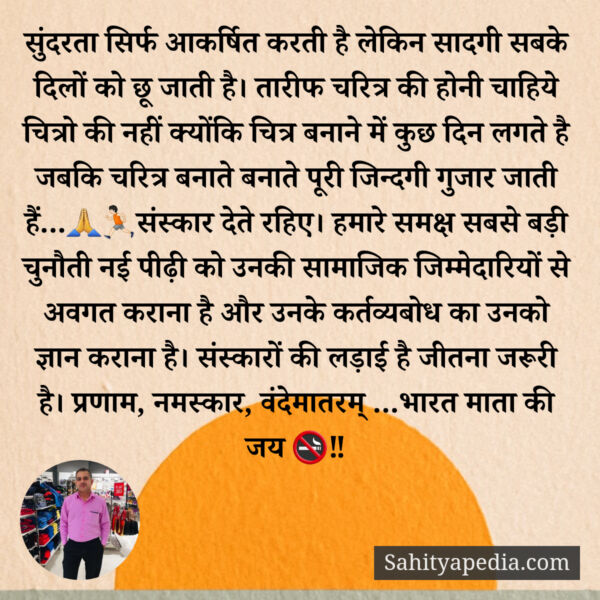 सुंदरता सिर्फ आकर्षित करती है लेकिन सादगी सबके दिलों को छू जाती है। तारीफ चरित्र की होनी चाहिये चित्रो की नहीं क्योंकि चित्र बनाने में कुछ दिन लगते है जबकि चरित्र बनाते बनाते पूरी जिन्दगी गुजार जाती हैं…🙏🏃🏻संस्कार देते रहिए। हमारे समक्ष सबसे बड़ी चुनौती नई पीढ़ी को उनकी सामाजिक जिम्मेदारियों से अवगत कराना है और उनके कर्तव्यबोध का उनको ज्ञान कराना है। संस्कारों की लड़ाई है जीतना जरूरी है। प्रणाम, नमस्कार, वंदेमातरम् …भारत माता की जय 🚭‼️