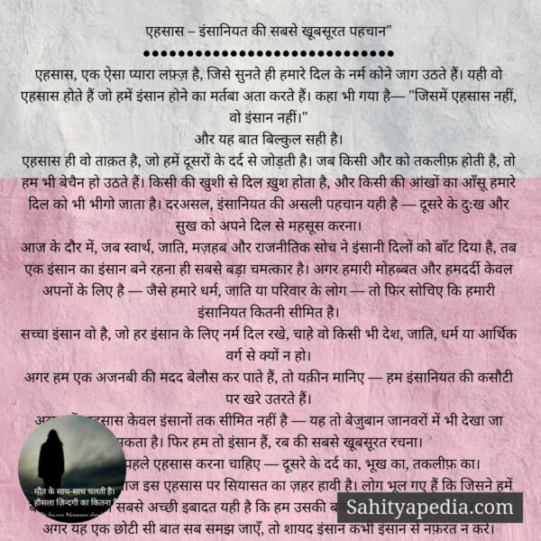 एहसास, एक ऐसा प्यारा लफ़्ज़ है, जिसे सुनते ही हमारे दिल के नर्म कोने जाग उठते हैं। यही वो एहसास होते हैं जो हमें इंसान होने का मर्तबा अता करते हैं। कहा भी गया है— “जिसमें एहसास नहीं, वो इंसान नहीं।”