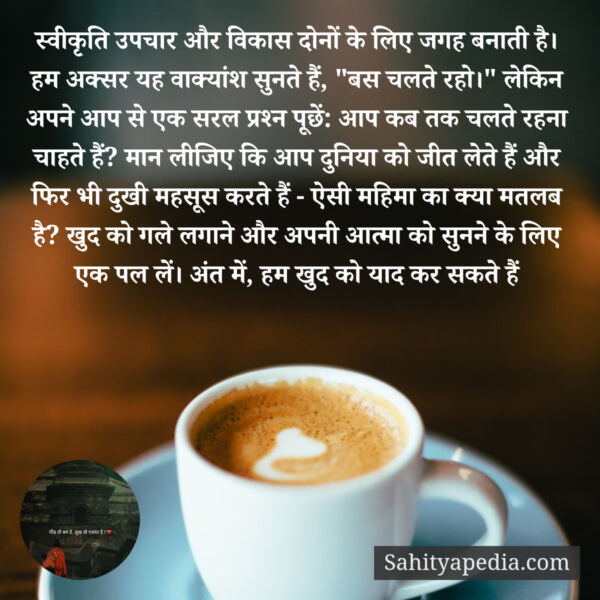 स्वीकृति उपचार और विकास दोनों के लिए जगह बनाती है। हम अक्सर यह वाक्यांश सुनते हैं, “बस चलते रहो।” लेकिन अपने आप से एक सरल प्रश्न पूछें: आप कब तक चलते रहना चाहते हैं? मान लीजिए कि आप दुनिया को जीत लेते हैं और फिर भी दुखी महसूस करते हैं – ऐसी महिमा का क्या मतलब है? खुद को गले लगाने और अपनी आत्मा को सुनने के लिए एक पल लें। अंत में, हम खुद को याद कर सकते हैं