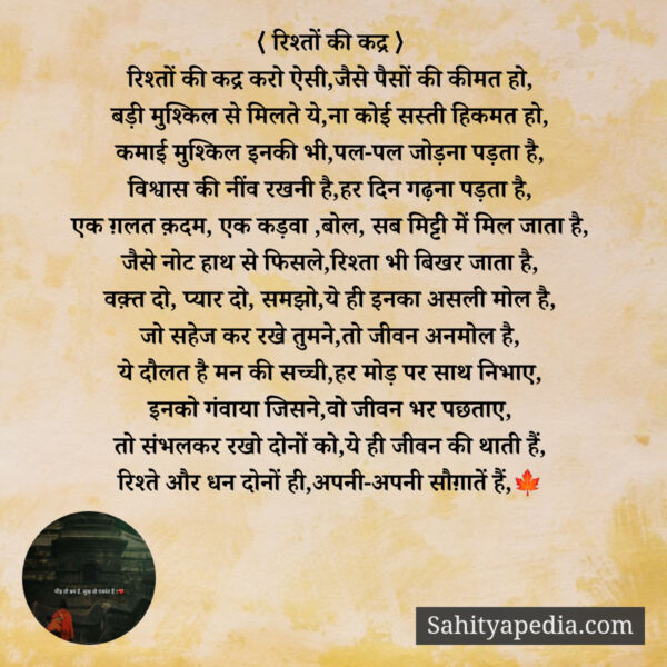 रिश्तों की कद्र करो ऐसी,जैसे पैसों की कीमत हो,