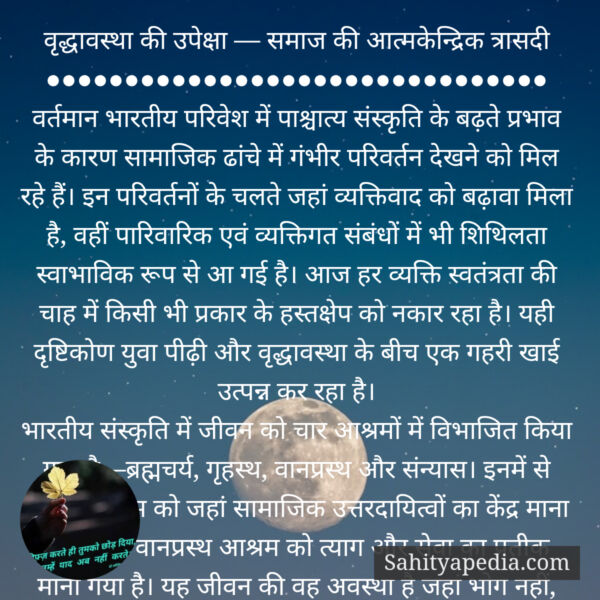 वर्तमान भारतीय परिवेश में पाश्चात्य संस्कृति के बढ़ते प्रभाव के कारण सामाजिक ढांचे में गंभीर परिवर्तन देखने को मिल रहे हैं। इन परिवर्तनों के चलते जहां व्यक्तिवाद को बढ़ावा मिला है, वहीं पारिवारिक एवं व्यक्तिगत संबंधों में भी शिथिलता स्वाभाविक रूप से आ गई है। आज हर व्यक्ति स्वतंत्रता की चाह में किसी भी प्रकार के हस्तक्षेप को नकार रहा है। यही दृष्टिकोण युवा पीढ़ी और वृद्धावस्था के बीच एक गहरी खाई उत्पन्न कर रहा है।