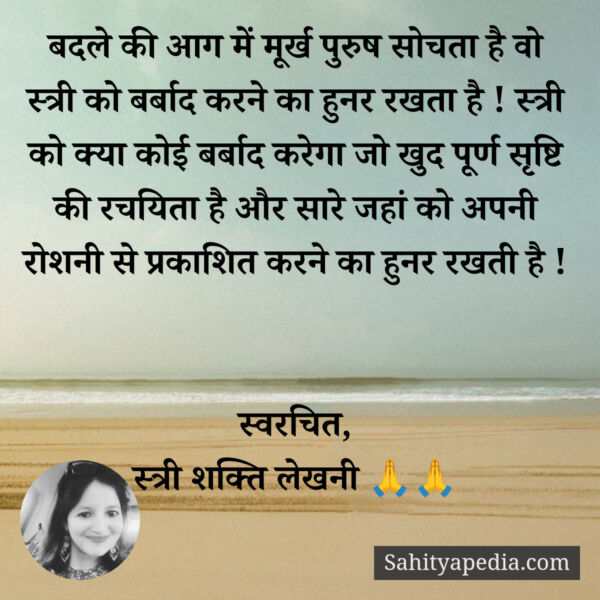 बदले की आग में मूर्ख पुरुष सोचता है वो स्त्री को बर्बाद करने का हुनर रखता है ! स्त्री को क्या कोई बर्बाद करेगा जो खुद पूर्ण सृष्टि की रचयिता है और सारे जहां को अपनी रोशनी से प्रकाशित करने का हुनर रखती है !