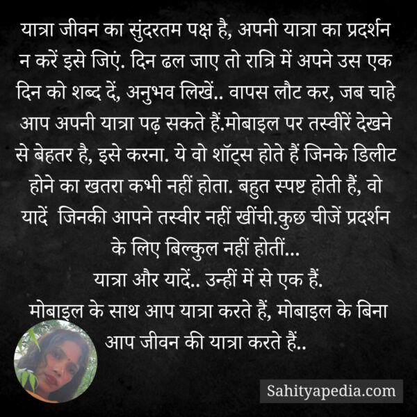यात्रा जीवन का सुंदरतम पक्ष है, अपनी यात्रा का प्रदर्शन न करें इसे जिएं. दिन ढल जाए तो रात्रि में अपने उस एक दिन को शब्द दें, अनुभव लिखें.. वापस लौट कर, जब चाहे आप अपनी यात्रा पढ़ सकते हैं.मोबाइल पर तस्वीरें देखने से बेहतर है, इसे करना. ये वो शॉट्स होते हैं जिनके डिलीट होने का खतरा कभी नहीं होता. बहुत स्पष्ट होती हैं, वो यादें जिनकी आपने तस्वीर नहीं खींची.कुछ चीजें प्रदर्शन के लिए बिल्कुल नहीं होतीं…