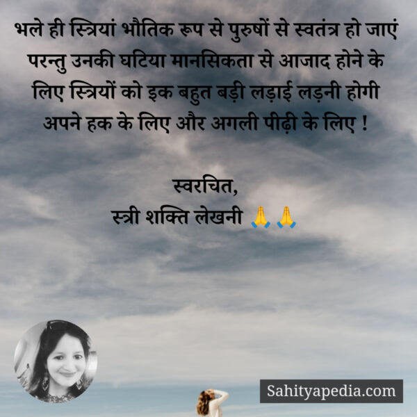 भले ही स्त्रियां भौतिक रूप से पुरुषों से स्वतंत्र हो जाएं परन्तु उनकी घटिया मानसिकता से आजाद होने के लिए स्त्रियों को इक बहुत बड़ी लड़ाई लड़नी होगी अपने हक के लिए और अगली पीढ़ी के लिए !