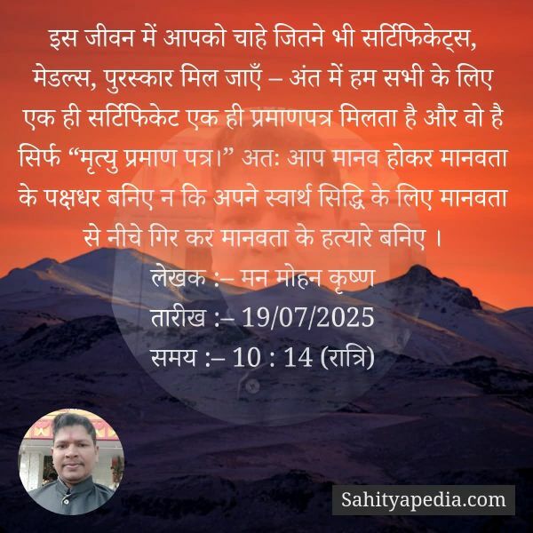 इस जीवन में आपको चाहे जितने भी सर्टिफिकेट्स, मेडल्स, पुरस्कार मिल जाएँ – अंत में हम सभी के लिए एक ही सर्टिफिकेट एक ही प्रमाणपत्र मिलता है और वो है सिर्फ “मृत्यु प्रमाण पत्र।” अतः आप मानव होकर मानवता के पक्षधर बनिए न कि अपने स्वार्थ सिद्धि के लिए मानवता से नीचे गिर कर मानवता के हत्यारे बनिए ।